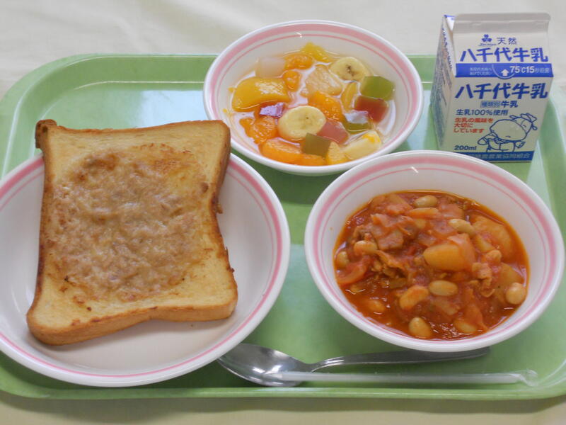 ハニートースト ポークビーンズ フルーツあえ 牛乳 |