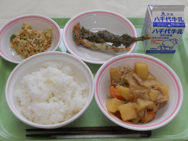 ごはん ししゃもの磯辺揚げ 肉じゃが 納豆和え 牛乳 |