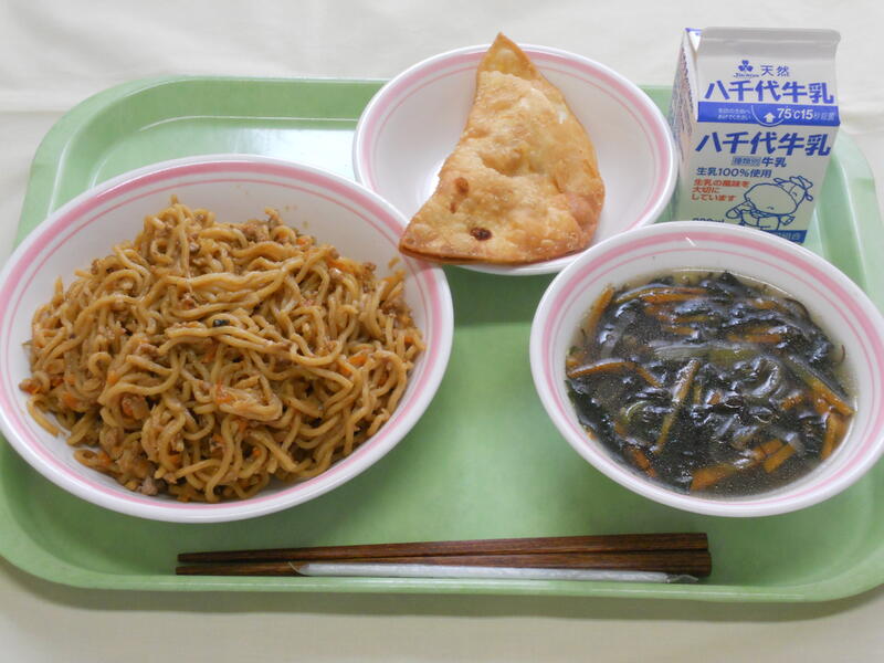 肉みそ混ぜそば もずくスープ かぼちゃの包み揚げ 牛乳 |