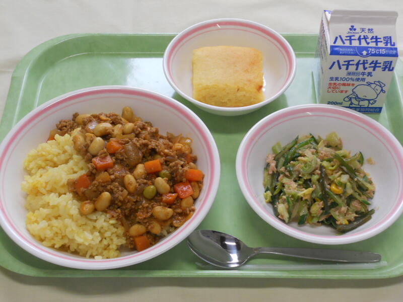 ターメリックライス チリコンカンライス(ソース) 茎わかめのツナサラダ スイートポテトパンケーキ 牛乳 |