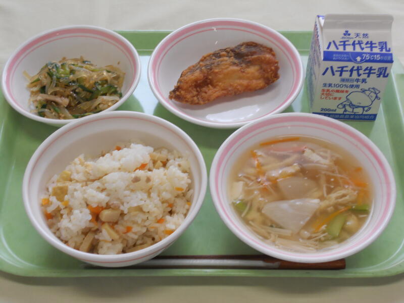たけのこごはん めばるの竜田揚げ 春雨サラダ かぶのすまし汁 牛乳 |