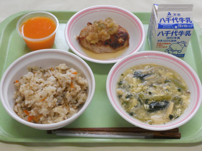 ピリ辛ごぼうごはん あじバーグのおろしかけ かき玉汁 キャロットオレンジゼリー 牛乳 |