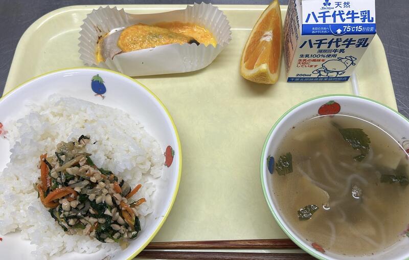 ごはん さけのもみじやき なっとうあえ ゆばすまし オレンジ 牛乳 |