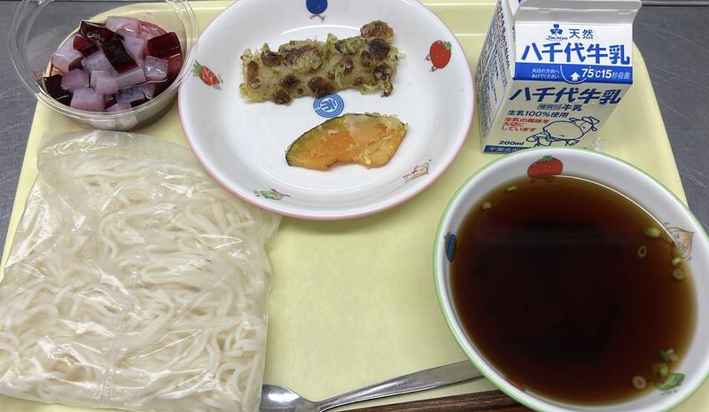 たなばたのひやむぎ おばけのてんぷら(ちくわ・かぼちゃ) あじさいゼリー 牛乳 |