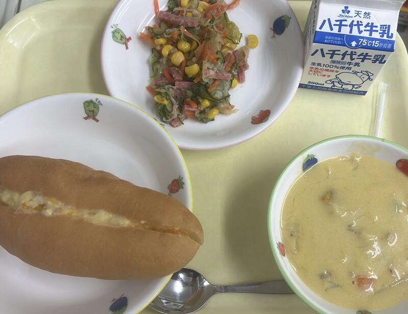 フルーツカスタードパン パンプキンシチュー サラミのサラダ 牛乳 |