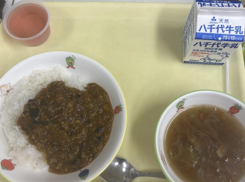 ごはん ドライカレー ジュリアンスープ ストロベリーゼリー 牛乳 |