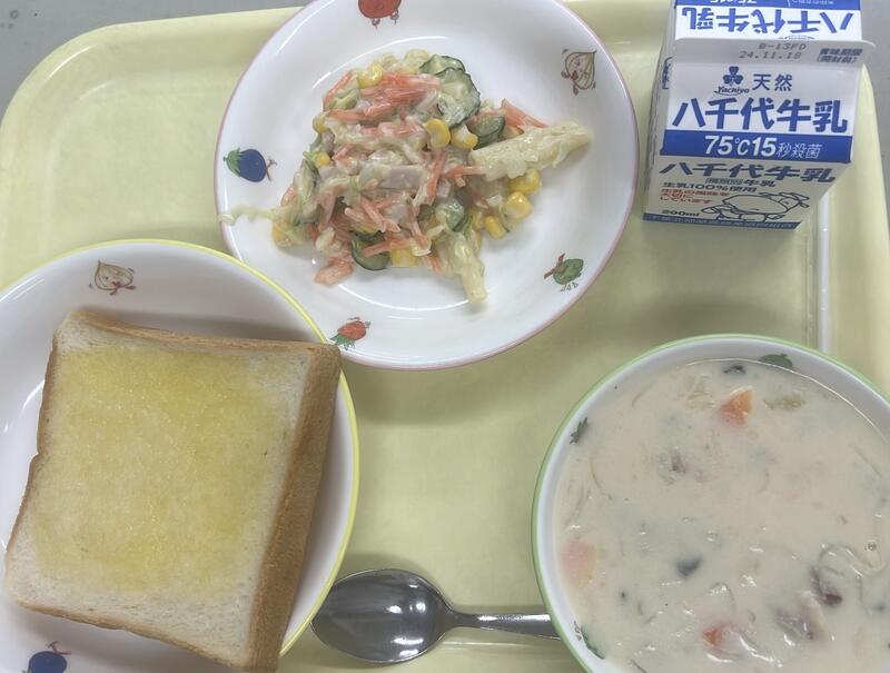 | コメント | 今日は、心も体も温まるクリームシチューを作りました。今はスーパーにいろんなシチューの素が売っていますが、給食室ではホワイトルウを手作りし、野菜のくずからとったスープで煮込んでいます。ホワイトルウはグラタンにも使用されますが、バターと小麦粉を弱火でじっくり炒めて作ります。シチューの仕上げにはピザ用のチーズを入れてコクを出しました。 |
