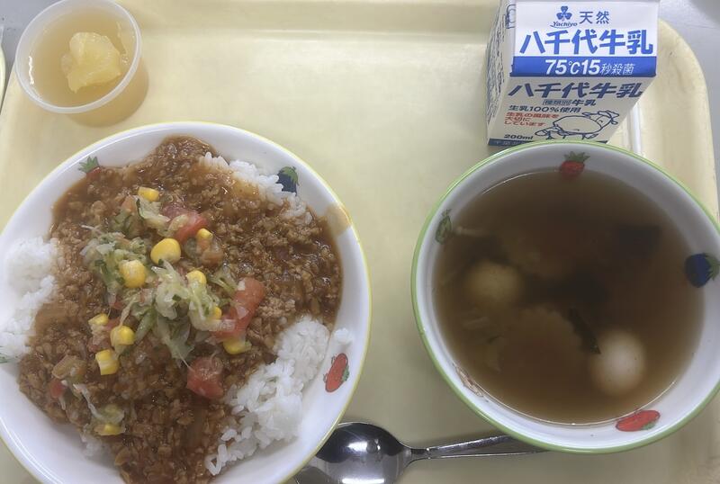 タコライス うずら卵とわかめのスープ パインゼリー 牛乳 |
