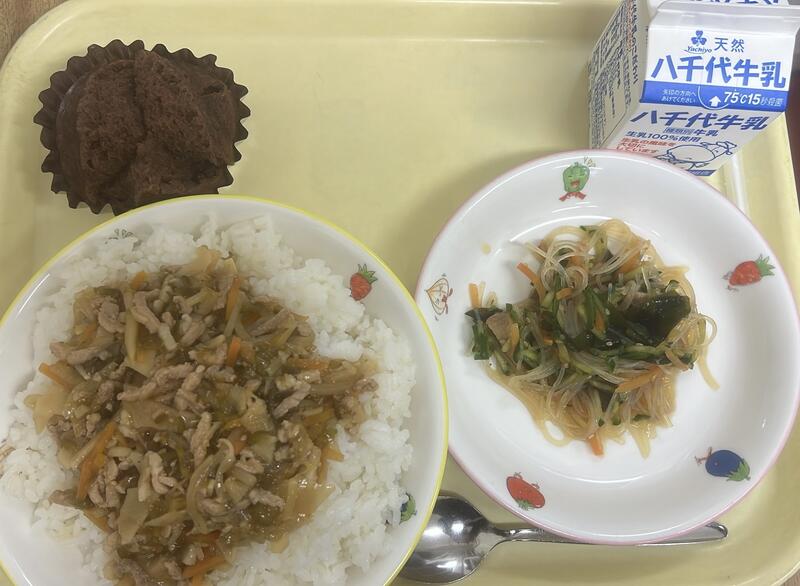 ごはん チンジャオロース バンバンスー ココア蒸しパン 牛乳 |