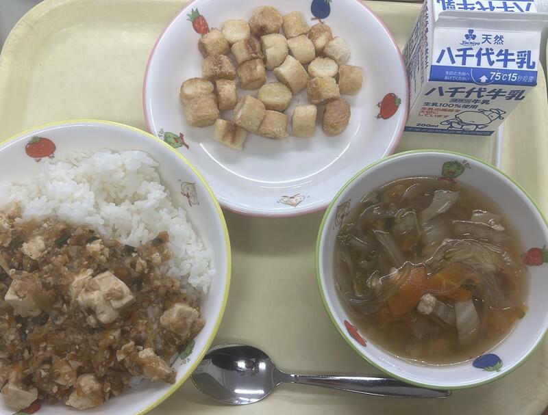 ごはん マーボー豆腐 春雨スープ おふのラスク 牛乳 |