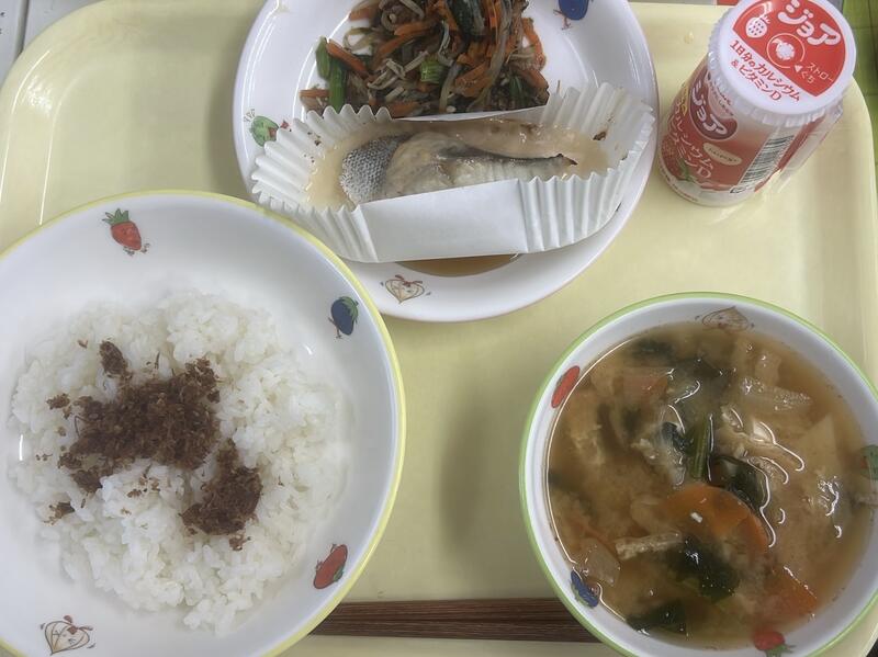 ごはん のりの佃煮 ほっけの西京焼き 豚汁 野菜チップス 牛乳 |
