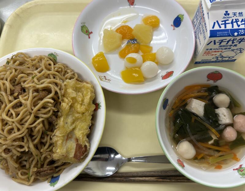 ソース焼きそば ちくわのカレー揚げ はんぺんのすまし汁 フルーツ白玉 牛乳 |