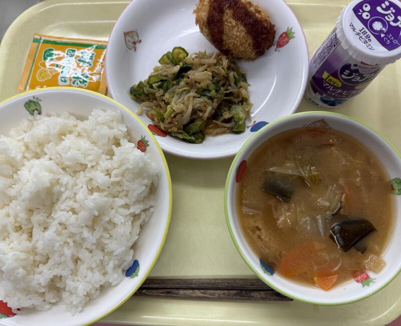 ごはん 野菜ふりかけ こまったさんのコロッケ もやしの梅かつお ジョア・ブルーベリー |
