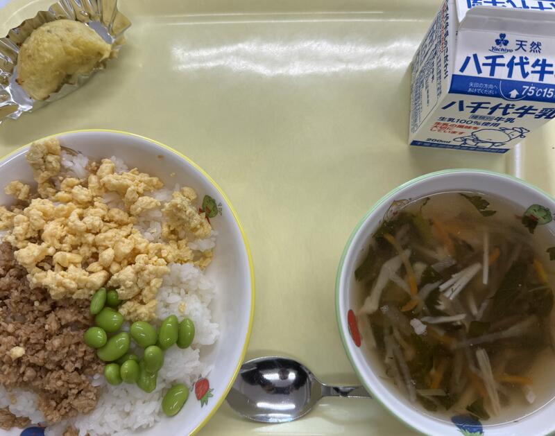 | コメント | 今日は、「そぼろ」をのせた丼です。「そぼろ」とは、ひき肉やえび、とき卵などを汁気がなくなるまでパラパラに炒めたものです。そして、「そぼろ」をさらに細かくしたものは「おぼろ」といいます。「でんぶ」は「おぼろ」の仲間だそうです。お寿司には、よくピンク色の「でんぶ」が入っていますね。デザートには、調理員さん手作りのスイートポテトがありますので、楽しみに食べてください! |