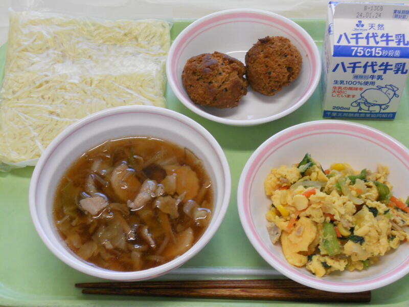 ラーメン(袋) しょうゆラーメン(スープ) ベーコンと野菜の卵炒め おから入りおさつドーナッツ(米粉) 牛乳 |