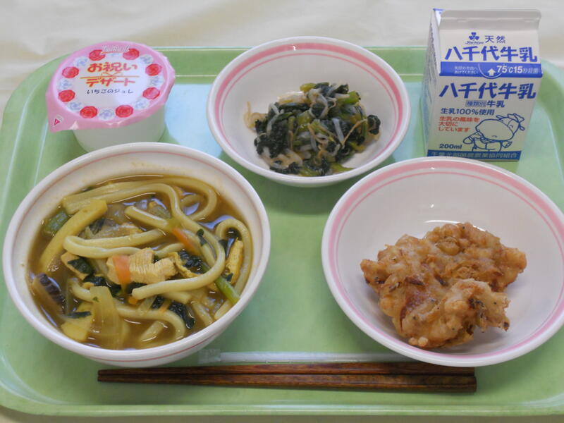 カレーうどん 大豆とじゃこのかき揚げ もやしと小松菜の梅和え いちごゼリー(既製品) 牛乳 |
