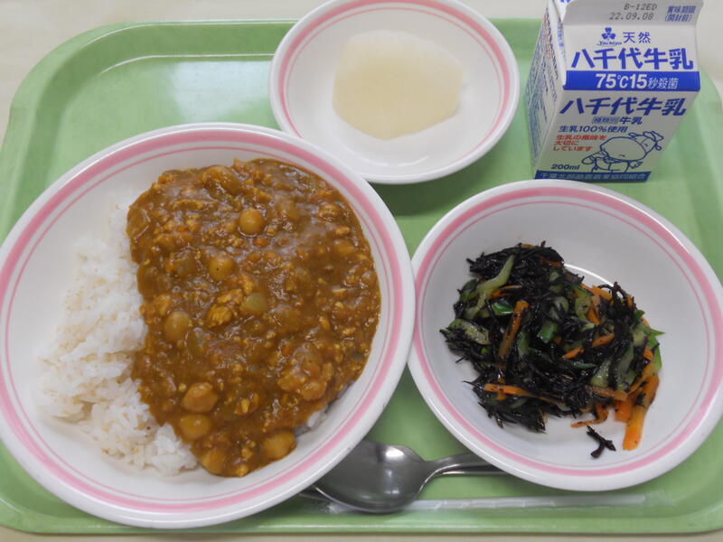 アマランサスごはん 挽肉とひよこ豆のカレー ひじきのマリネ 梨(豊水) 牛乳 |