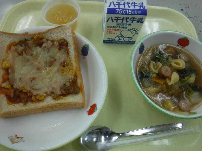コメント 今日は具だくさんのピザトーストです。ウインナー、ベーコン、マッシュルーム、コーン、玉ねぎを炒めて味つけし、チーズをたっぷりのせて焼きました。ピザトーストは「ピッツァぼうやのピザ」という絵本をもとに作りました。ピートくんは、友だちと外で遊ぼうと思ったのに、雨がふってきてご機嫌ななめです。「何か楽しいことはないかな?」と考えたお父さんは「ピートでピッツァを作ってみよう!!」と思いつきます。ピートはピッツァになってしまうのかな?続きはぜひ絵本を読んでくださいね。