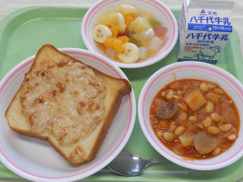 ツナトースト ポークビーンズ カクテルゼリー和え 牛乳 |