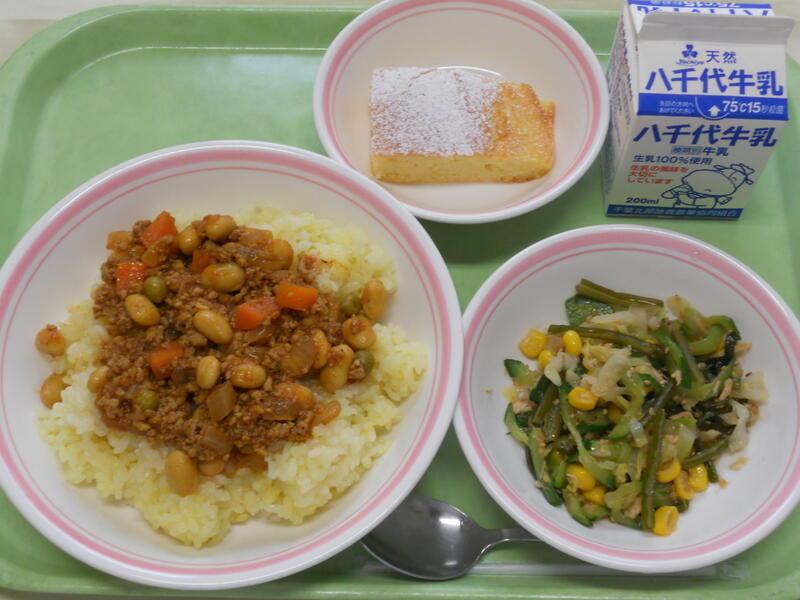 チリコンカンライス(ライス) チリコンカンライス(ソース) 茎わかめのツナサラダ 白いんげん豆のパンケーキ 牛乳 |