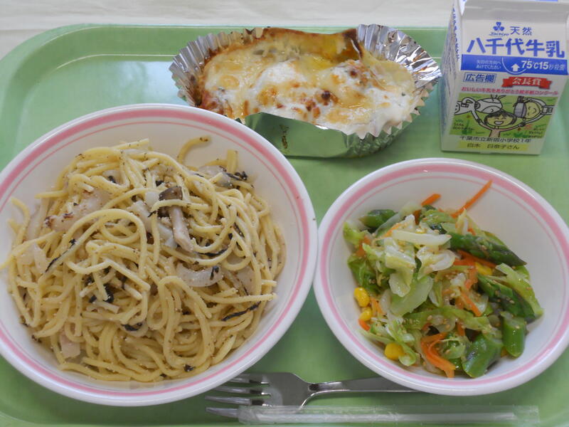 たらこスパゲティ 南瓜のチーズ焼き アスパラサラダ 牛乳 |