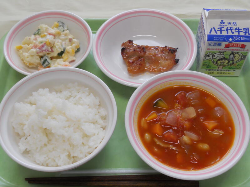 ごはん 鶏肉のマーマレード焼き コロコロポテトサラダ ミネストローネ 牛乳 |