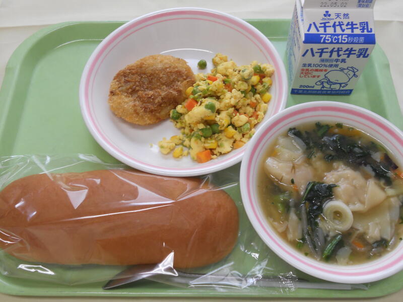 コメント 今日はコッペパンだったので、コロッケとスクランブルエッグをはさみ、2種類の味を楽しみました。