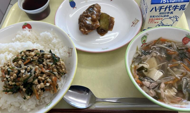 | コメント | 今日の給食は、「みそらーめん」です。ラーメン屋さんのように、けずり節やこんぶも使ってスープを作っているそうです。料理のだしやスープによく使うのは、かつお節・こんぶ・にぼし・とりガラ・とんこつなど。いろんな種類があり、それぞれに「うま味」があります。お水だけで、みそ汁やスープを作っても美味しい料理にはなりません。この「うま味」には種類があり、かつお節なら「イノシン酸」、こんぶなら「グルタミン酸」など。何種類かを組み合わせると、さらに美味しいだしになります。 |