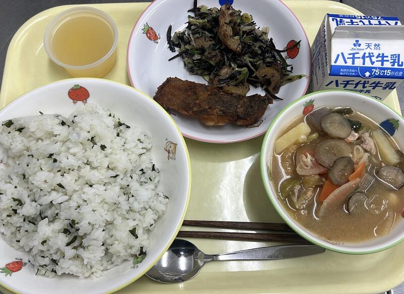 わかめごはん たらのさらさあげ とんじる ひじきのマリネ リンゴゼリー 牛乳 |