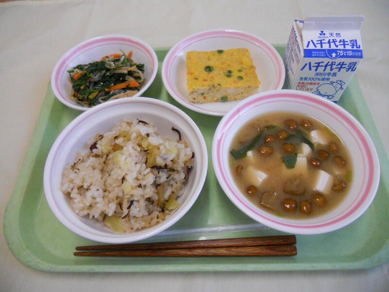 鶏五目ごはん いなだの竜田揚げ もやしのひじきの酢の物 さつまいものみそ汁 牛乳 |