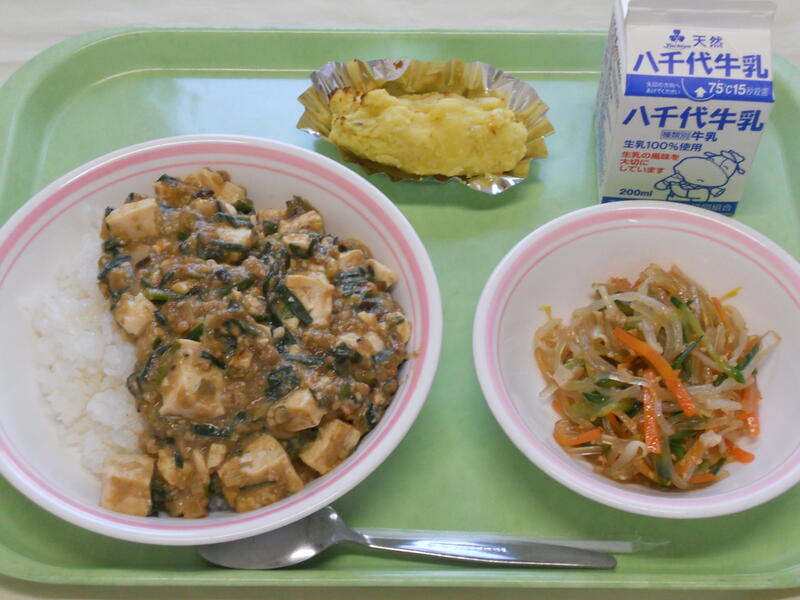 ごはん 麻婆豆腐丼(具) 春雨サラダ スイートポテト 牛乳 |