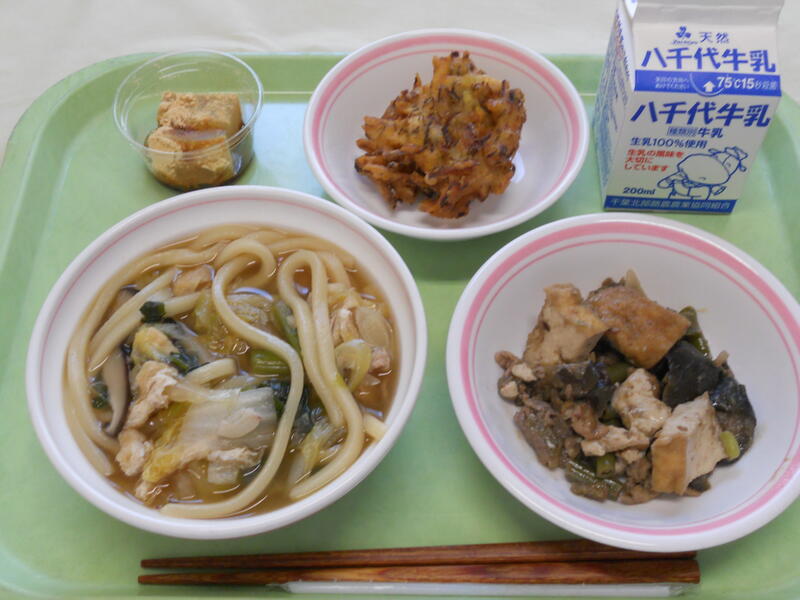 煮込みうどん もずくかき揚げ なすと生揚げのみそ炒め わらび餅 牛乳 |