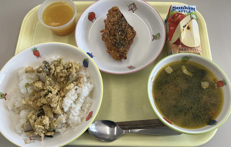 カレーピラフ フライドチキン ジュリアンスープ フルーツのヨーグルト 牛乳 |
