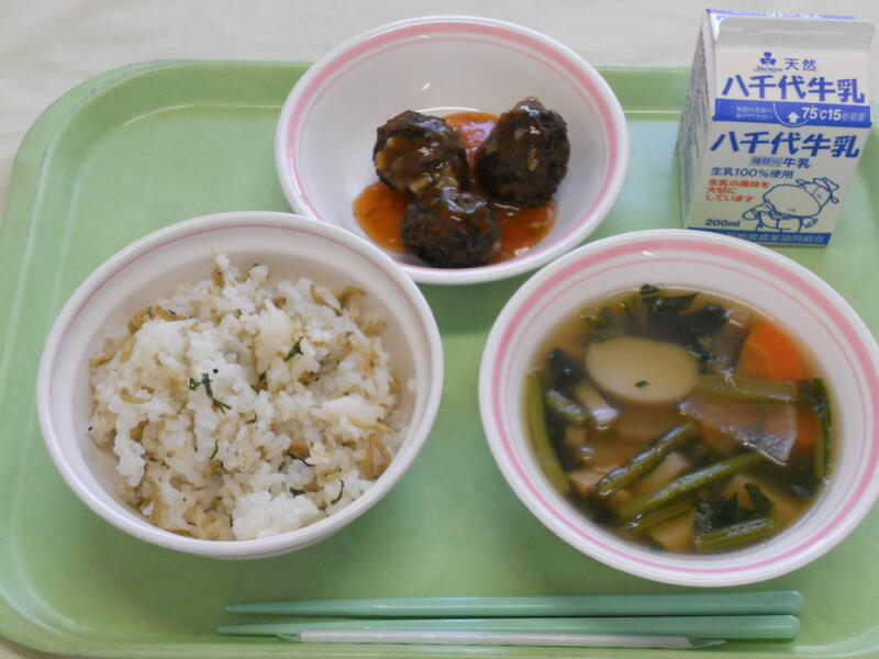 コメント じゃこ飯は、じゃことしその味がとてもよく、しっかりとかんで食べられるメニューだと思います。肉団子は周りがカリカリとしていて、おいしかったです。レバーそぼろが入っていますが、レバーが苦手な生徒もサクッと食べられると思います。入っているおからとひじきもいい感じでした。明日のレバーそぼろを使った三色丼も楽しみです。