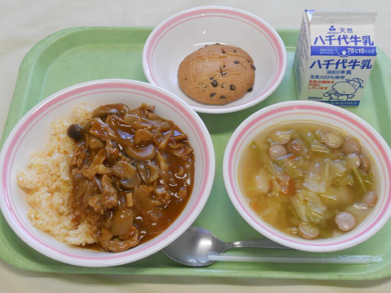 コメント ハッシュドポークは、ビーフではなくポーク、とは考えつきそうで考えたことがなかったですが、とてもおいしかったです。チョコチップクッキーは、給食では初めて食べました。しっとりで、表面はカリッとしていて、とてもおいしかったです。生徒たちも喜んでいると思います。ごちそうさまでした。