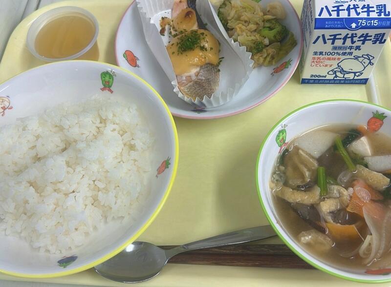 ごはん 鮭のみそマヨネーズ焼き キャベツの梅かつお けんちん汁 りんごゼリー 牛乳 |