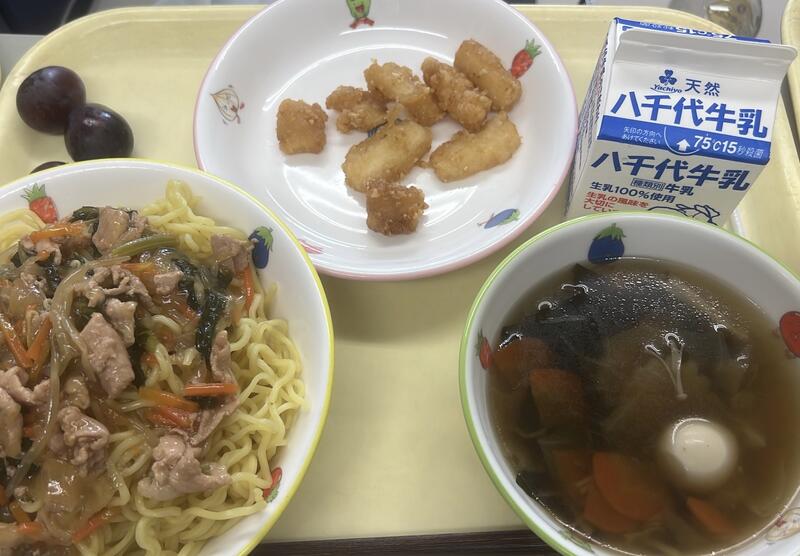 豚肉と小松菜の焼きそば うずら卵とわかめのスープ イカのかりん揚げ ぶどう 牛乳 |