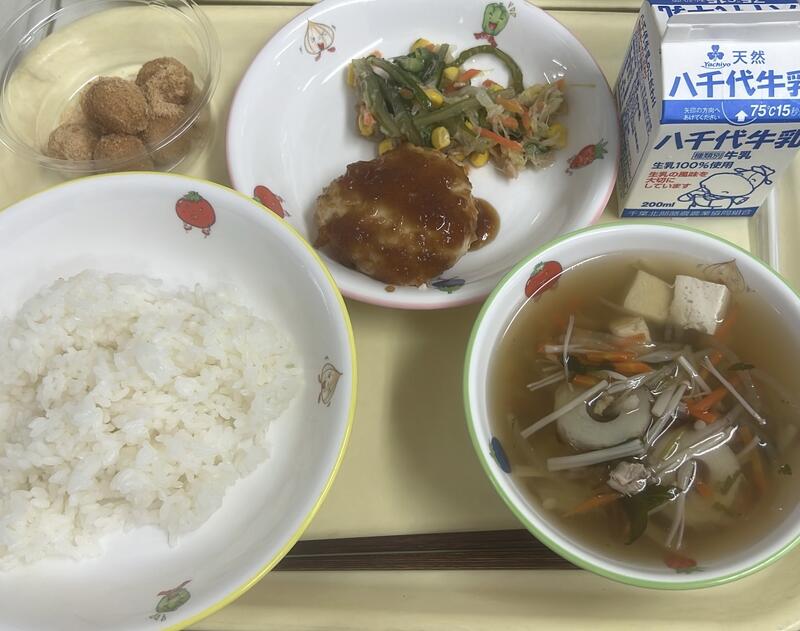 ごはん 和風ハンバーグ ツナサラダ ちくわとえのきのすまし汁 きなこ白玉 牛乳 |