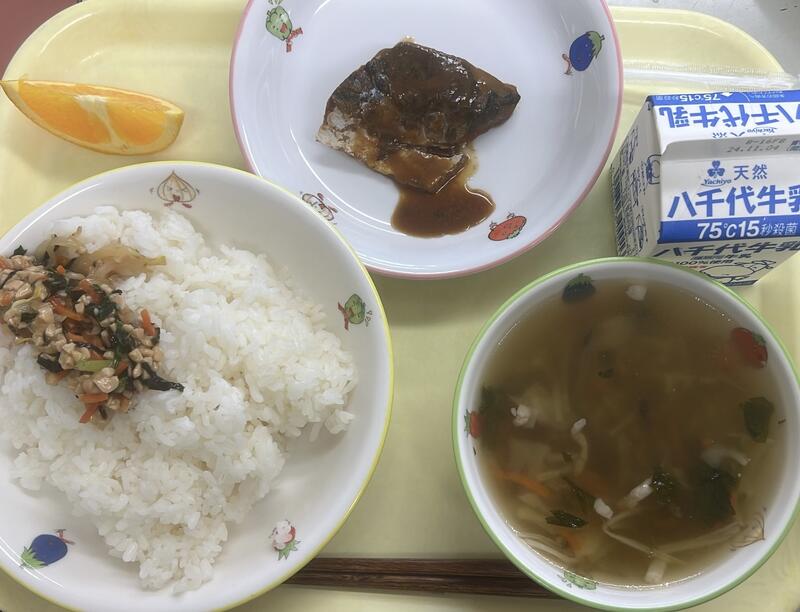 ごはん 手作りふりかけ たらフライ ABCスープ ひじきのマリネ 牛乳 |