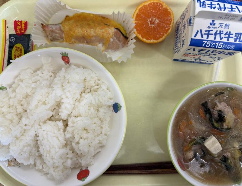 ごはん さけの塩バター焼き かきたま汁 焼肉サラダ みかんゼリー 牛乳 |