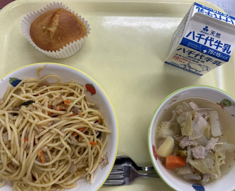 | コメント | 今日の主食は、昔から洋食屋さんや喫茶店で見かけるナポリタンです。ナポリタンとは、スパゲッティを玉ねぎ・ピーマンなどと炒めて、トマトケチャップで味付けした、日本で考えられたスパゲッティ料理のことです。ナポリタンのはじまりは、いろいろな説がありますが、戦後のアメリカ軍によって持ち込まれたケチャップ味のスパゲッティだったようです。それを日本人がアレンジしました。 |