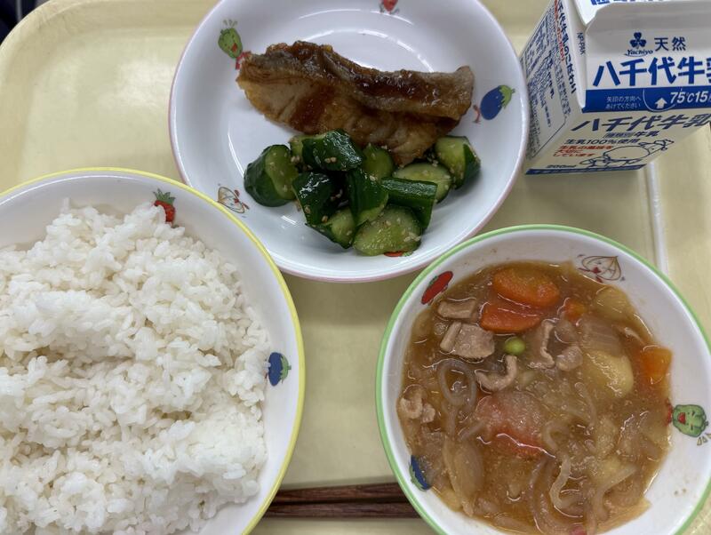 | コメント | 今日からいよいよ給食が始まりました。最初の給食は、「ハヤシライス」です。やわらかくてよく噛まずに食べれてしまいますが、しっかりよく噛んで食べましょう。よく噛んで食べると、お腹の調子が良いだけでなく、栄養もたっぷりと摂ることができます。 |