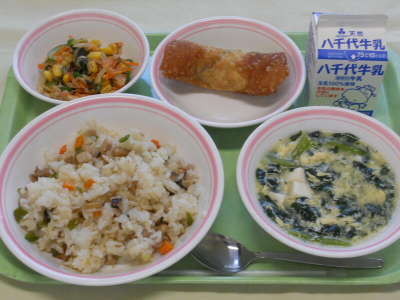 焼き豚チャーハン ひじき春巻き 大根ツナサラダ 中華卵スープ 牛乳 |