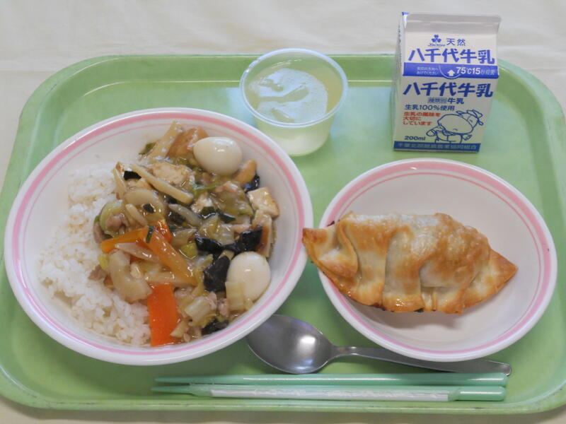 コメント 中華丼は具材が豊富で、食感を楽しみながら食べることができました。ちくわを入れたことはないのですが、おいししいしボリュームも出る、だしも出るのでいいですね。焼き餃子も、皮もあんもおいしかったです。“売れます”と言ってしまうくらい大満足でした。生徒達も好きなメニューだと思います。また、ゼリーに入っていたナタデココも、給食で食べたのは初めてでした。