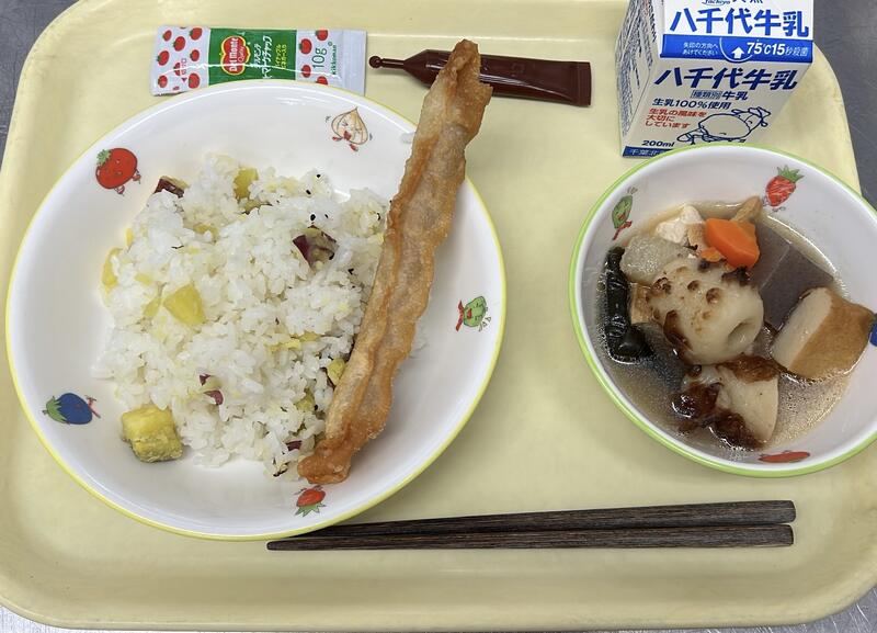 さつまいもごはん おでんのおうさま えんぴつのてんぷら ミルメーク(ココア) 牛乳 |