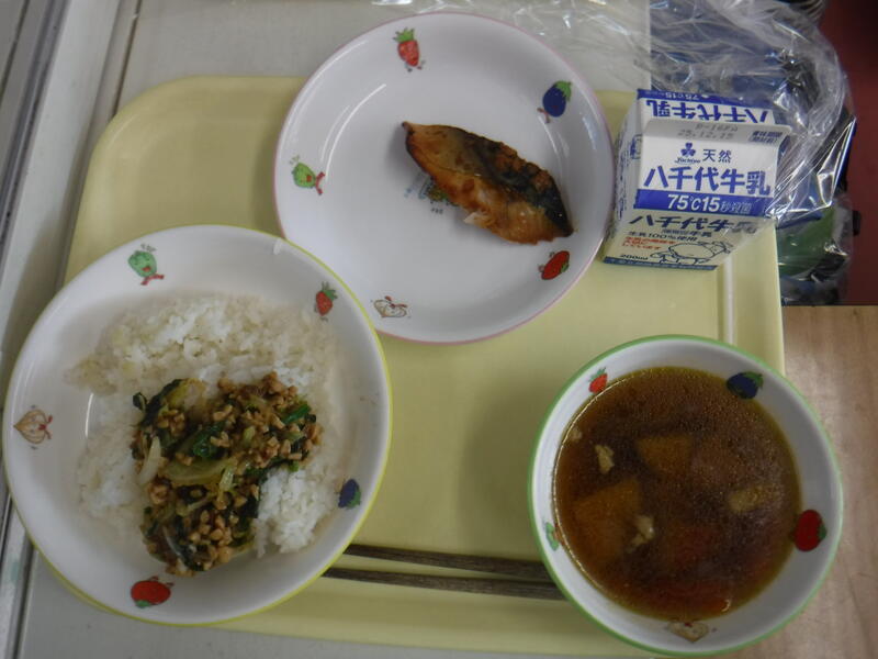 ごはん さばのトウバンジャン焼き 納豆和え おざく 牛乳 |