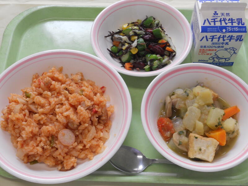 ジャンバラヤ 夏野菜のポトフ ビーンズサラダ 牛乳 |