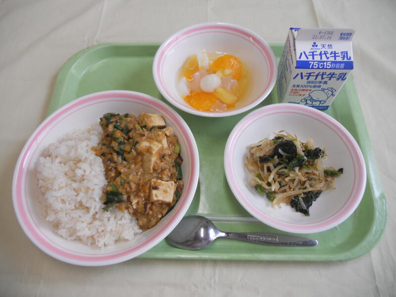 アマランサスごはん 麻婆豆腐丼(具) もやしのナムル ルルとララの白玉フルーツ杏仁 牛乳 |