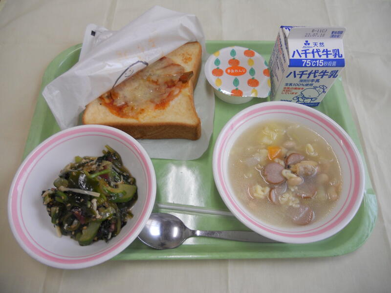 ピザトースト ABC スープ 海草サラダ フローズンオレンジゼリー(既製品) 牛乳 |