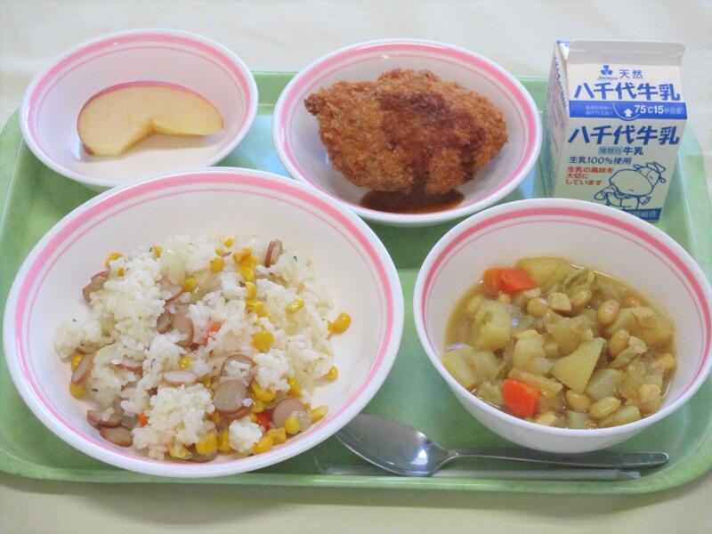 コーンとウインナーのピラフ キャベツメンチカツ 野菜のカレースープ煮 りんご 牛乳 |